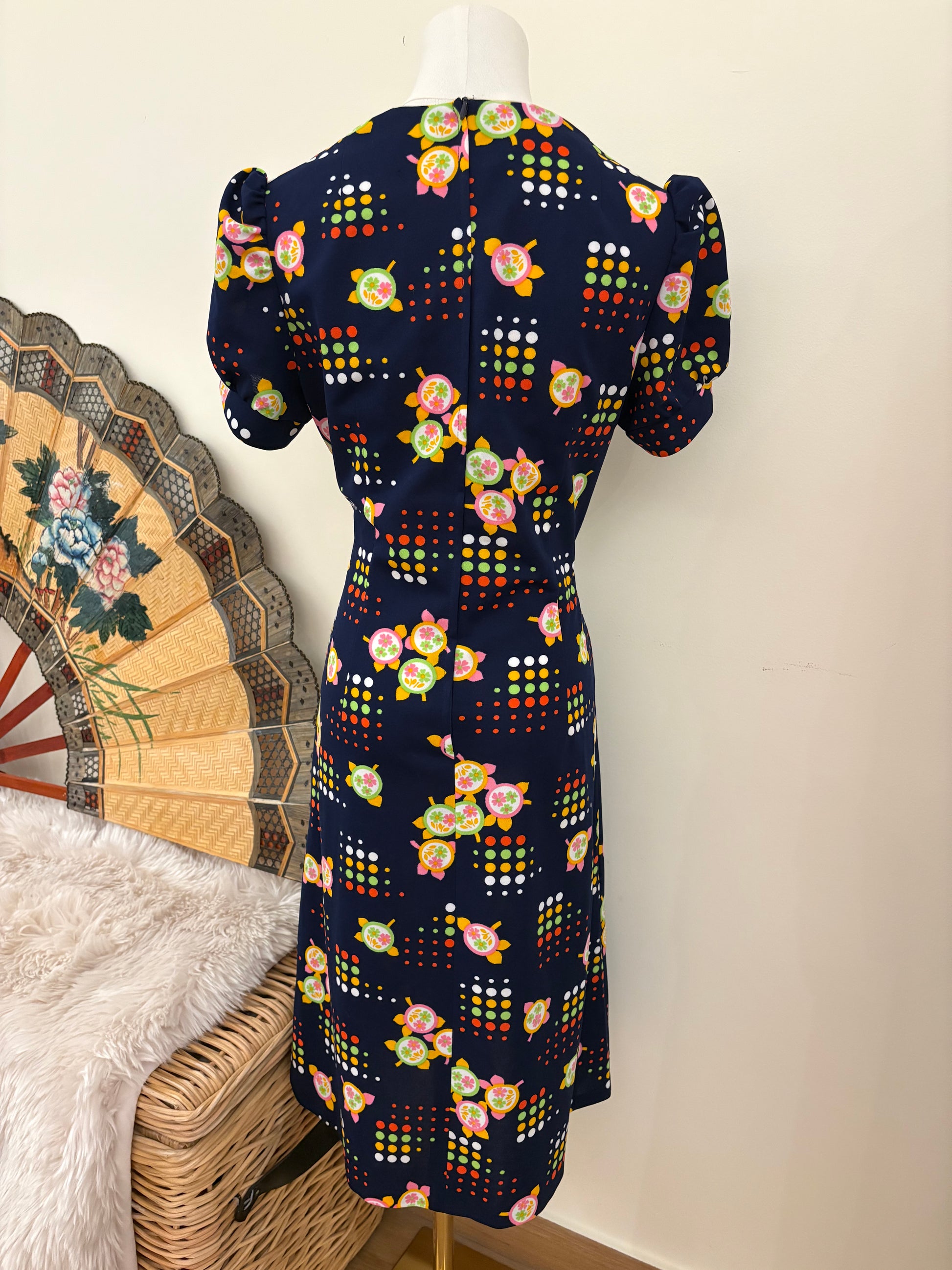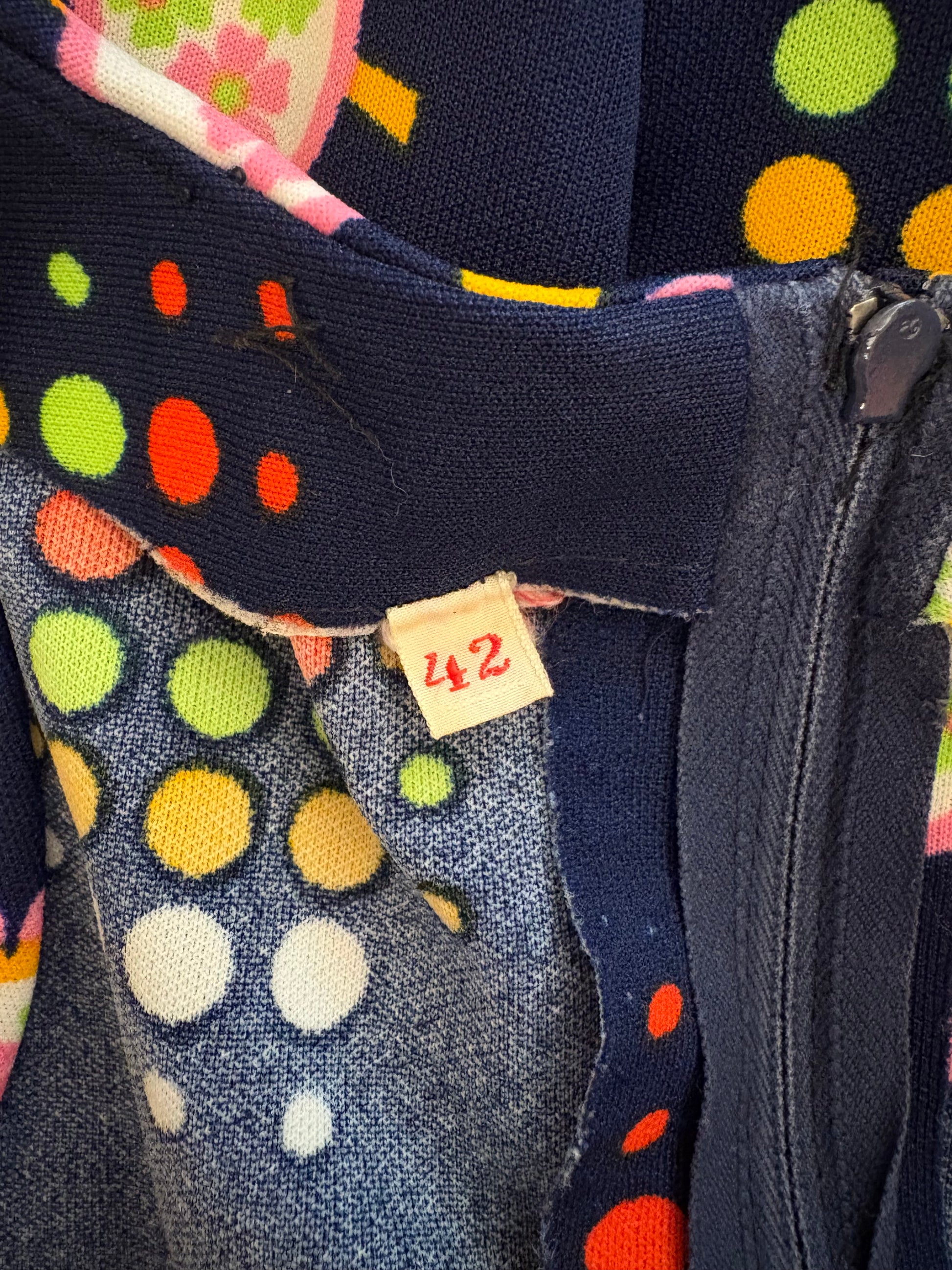 A playful pop of the 60s — this vintage beauty features a sweetheart neckline, vibrant floral bursts, and a geometric dot print that feels straight off Carnaby Street. Originally a relaxed fit, we’ve lightly pinned it at the waist for display. On the body, it drapes with ease — flattering yet comfortable, perfect for dancing, brunching, or just being the best-dressed at the market.