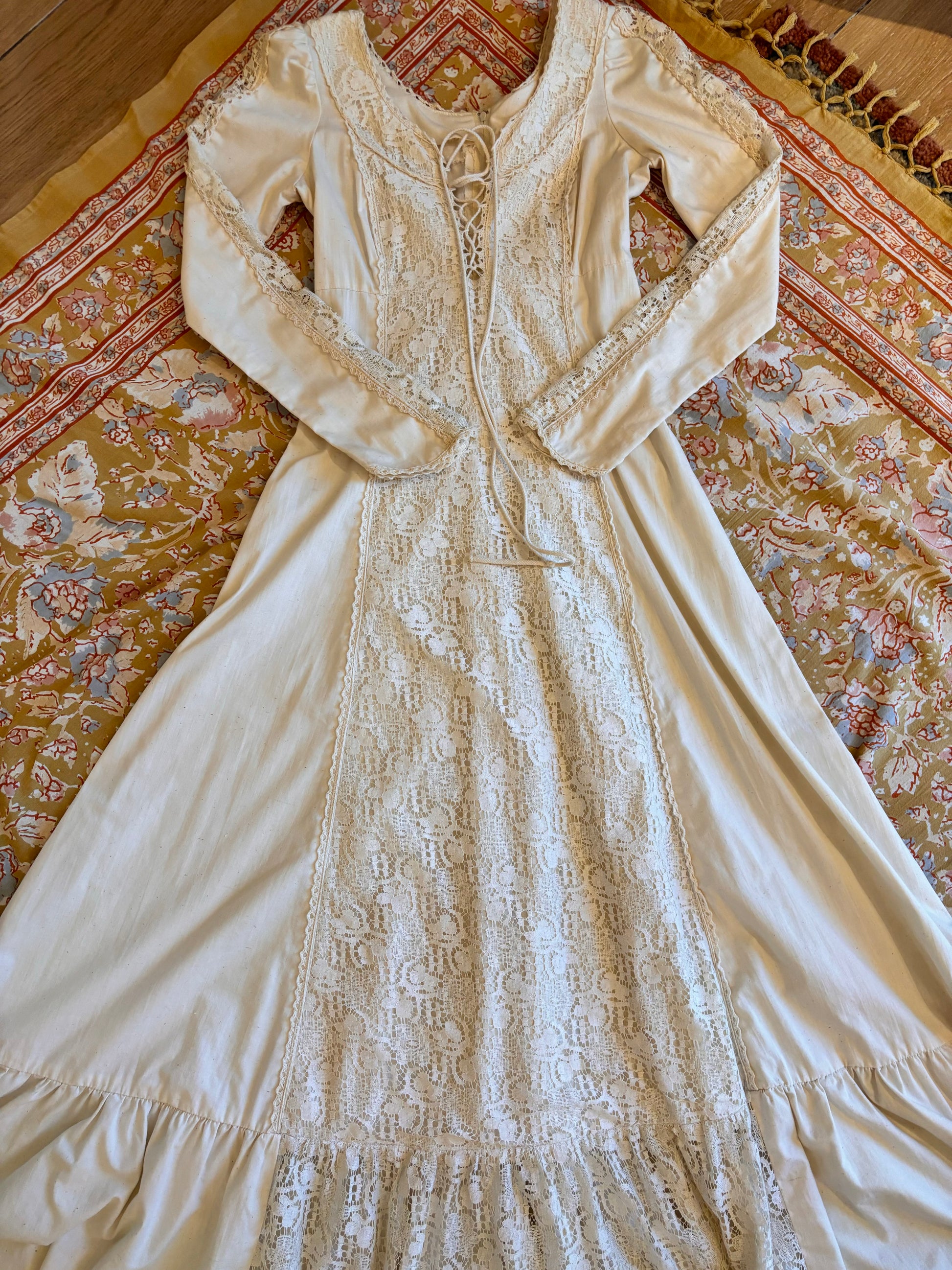 Channel your inner boho with this 70s Gunne Sax lace dress. With delicate lace detailing and a flowy silhouette, this dress is perfect for any free-spirited occasion.