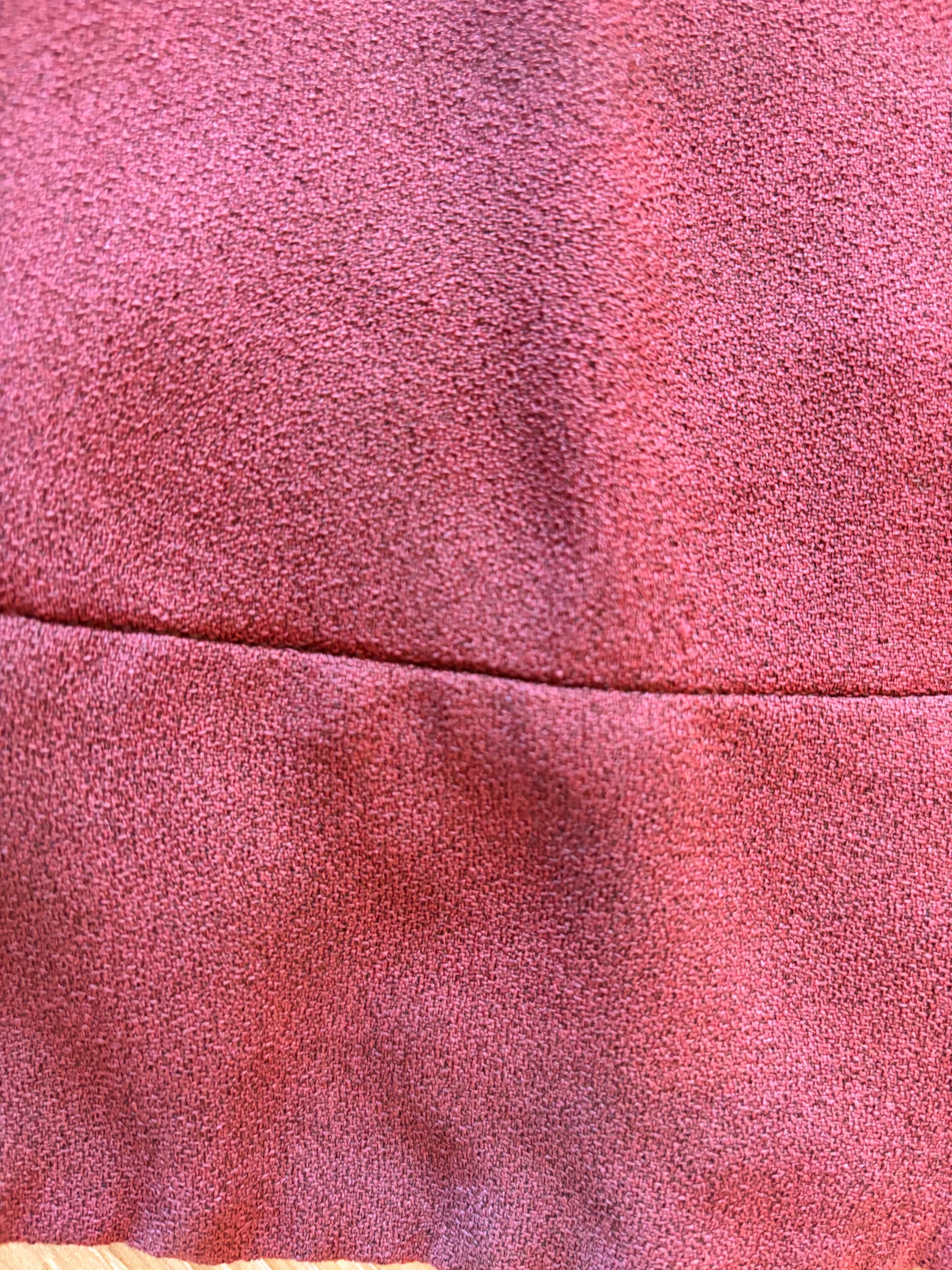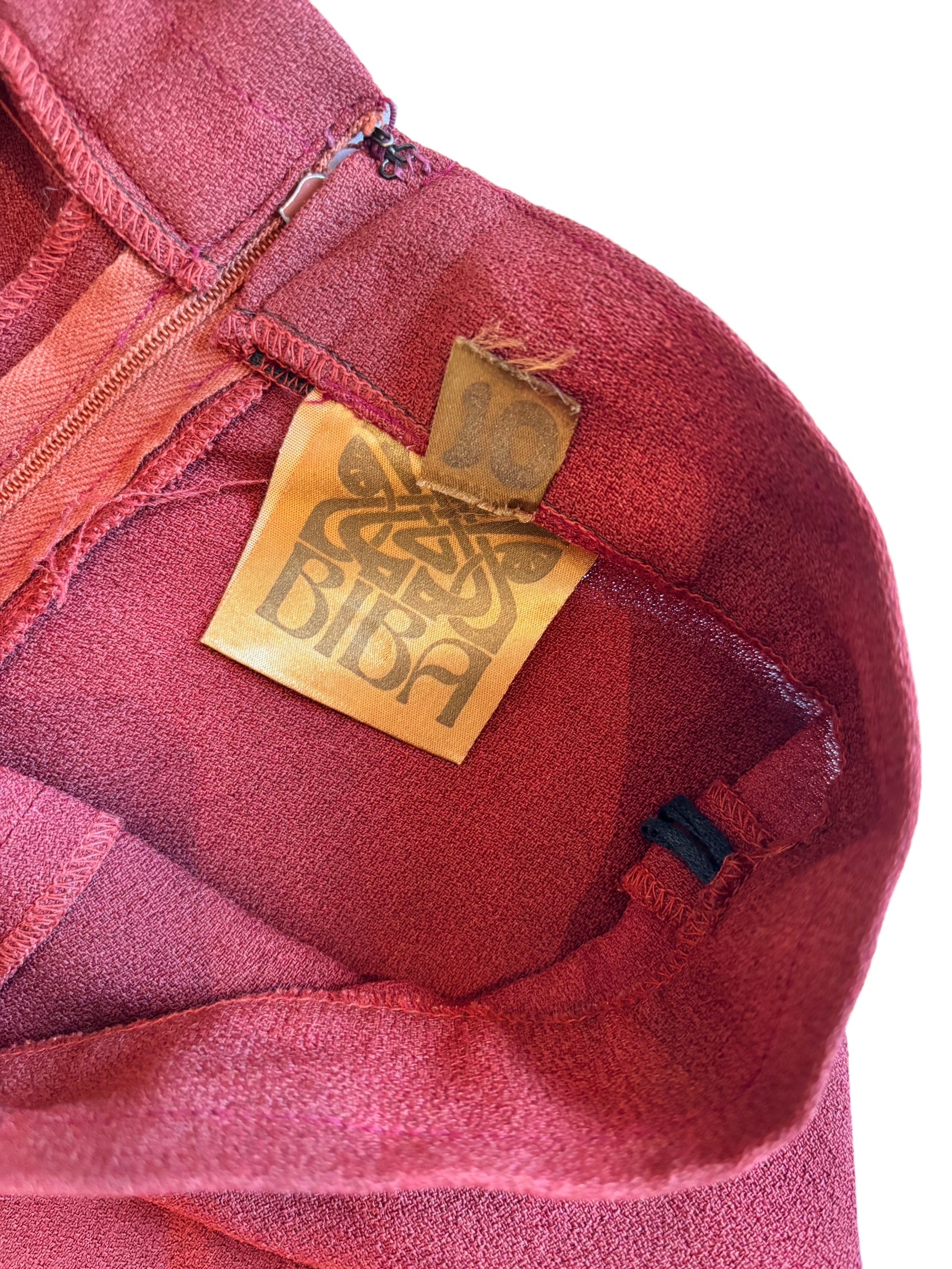 Experience the timeless elegance of the 1970s with this iconic Biba ensemble in a stunning deep red. The delicate pleating at the shoulder creates a soft, draped effect that adds to the garment's sophisticated appearance. The midi length A-line skirt pairs perfectly with the fitted waistband, making this ensemble both classy and versatile.