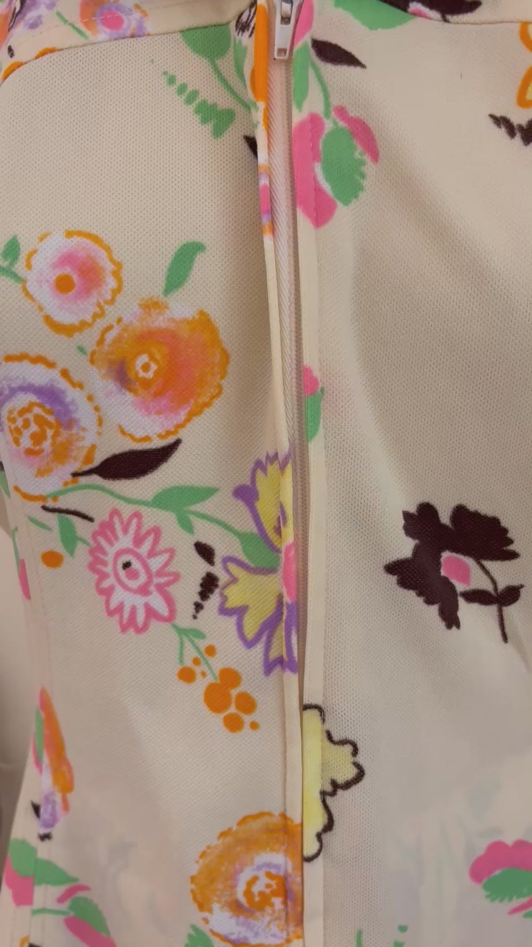 This vintage dress from the 1970s evokes a sense of carefree springtime with its vibrant colours and playful swing silhouette.