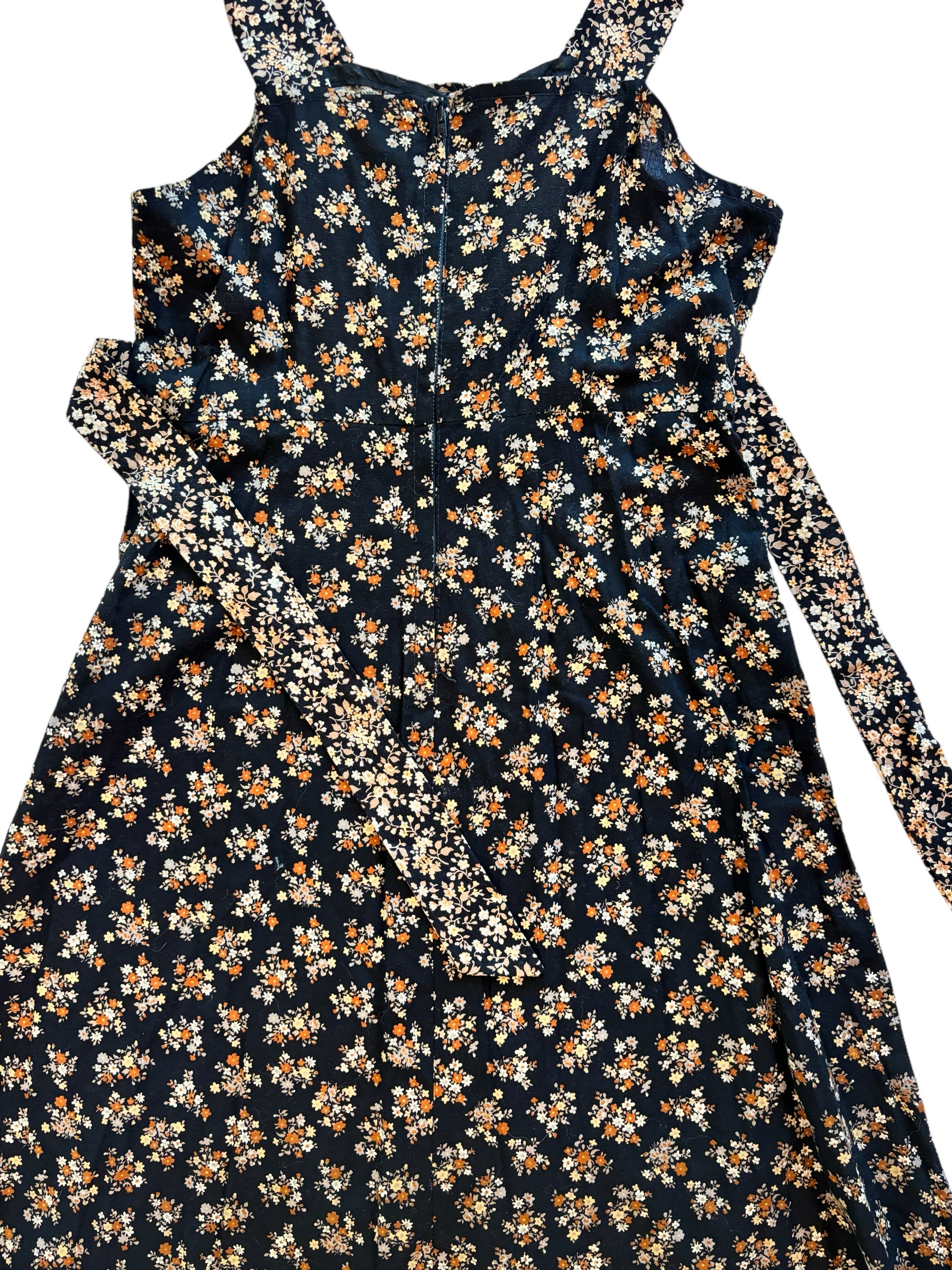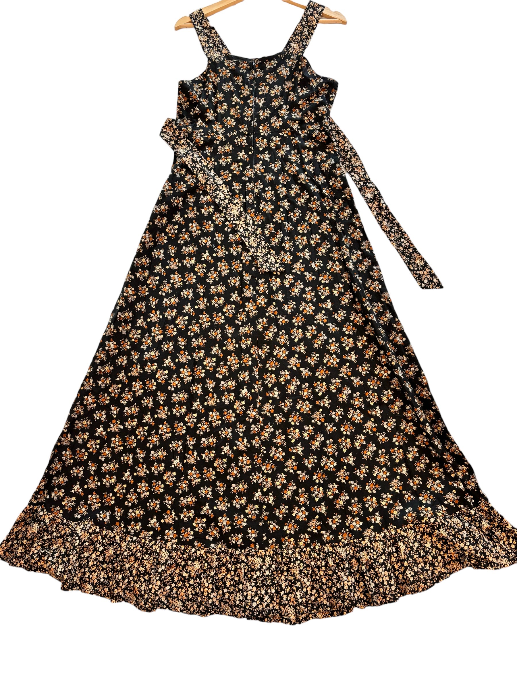 This 1970s maxi dress flaunts a sleeveless style with a snug bodice and a softly flared skirt that cascades into a full hem. It displays a lovely print of clustered blooms on a rich backdrop, creating a striking contrast that brings out the floral design. The skirt flares out in an A-line silhouette from the waist and ends with a playful ruffled edge.