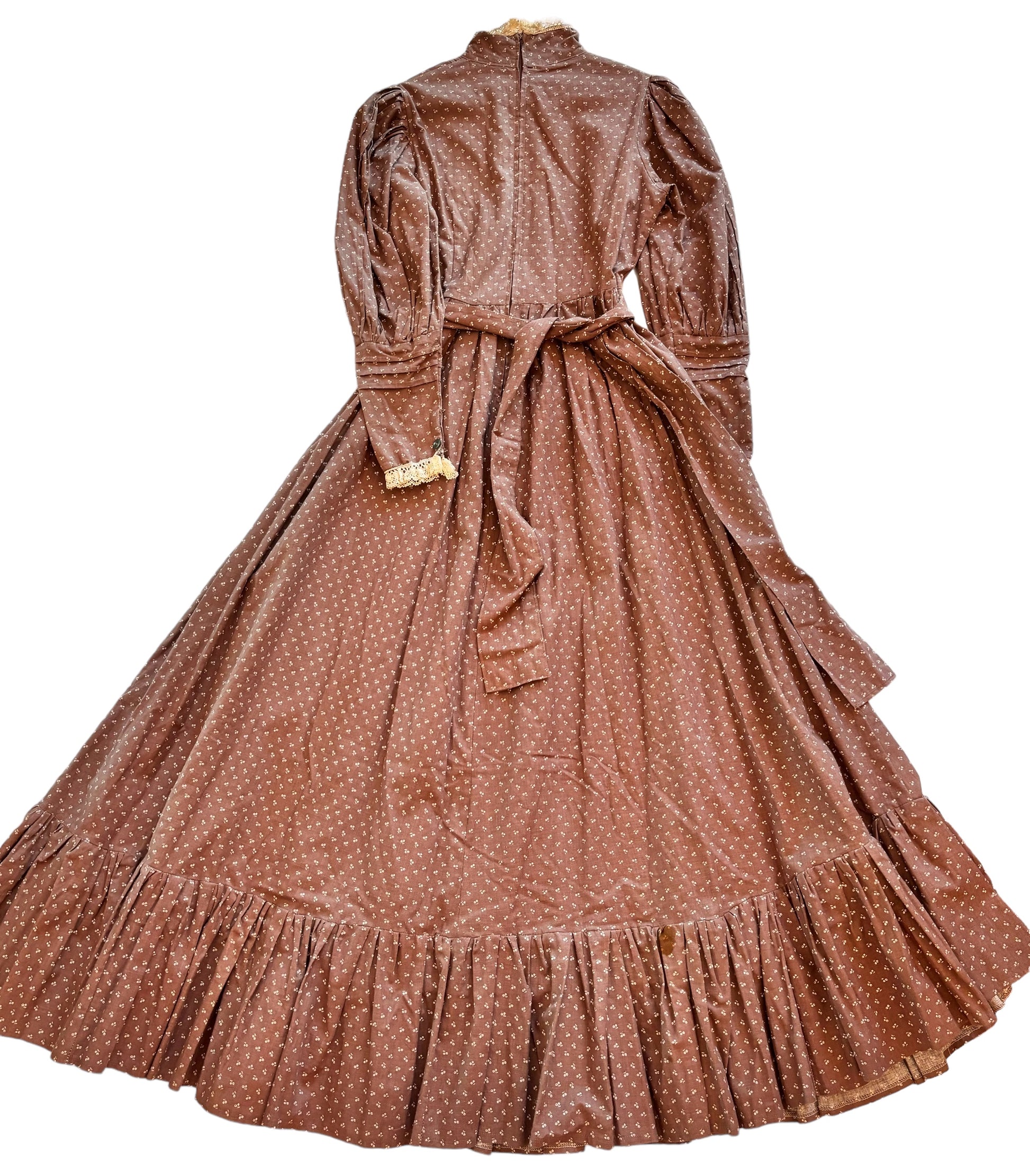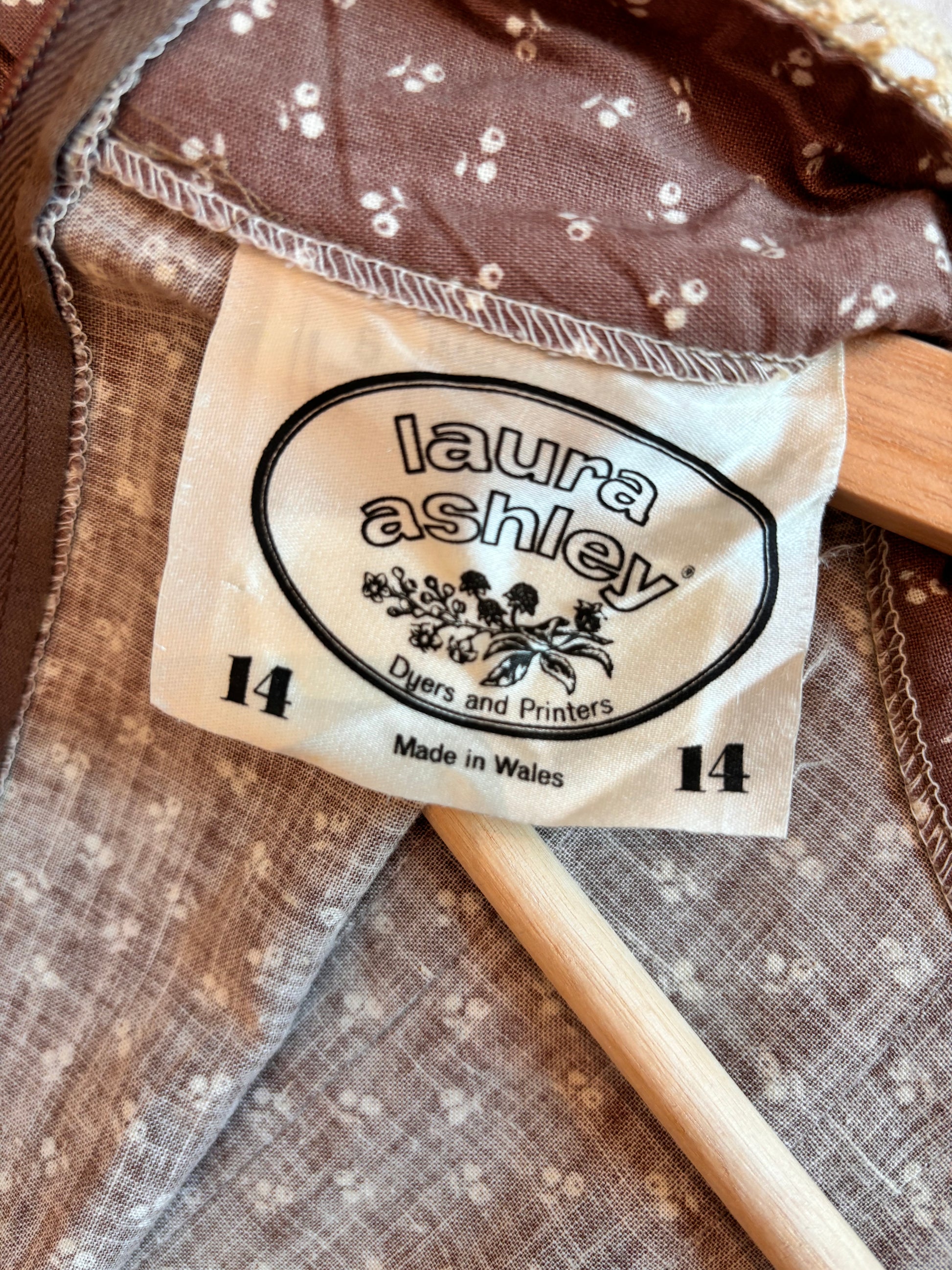 Embrace Victorian charm with this 1970s Laura Ashley Prairie Dress featuring a high neck collar and elegant lace cuffs. The waist-cinching belt adds a touch of sophistication while the generous skirt and ruffled hem heighten its traditional appeal. Exude a passionate belief in the value of this dress as it brings out your inner romantic.