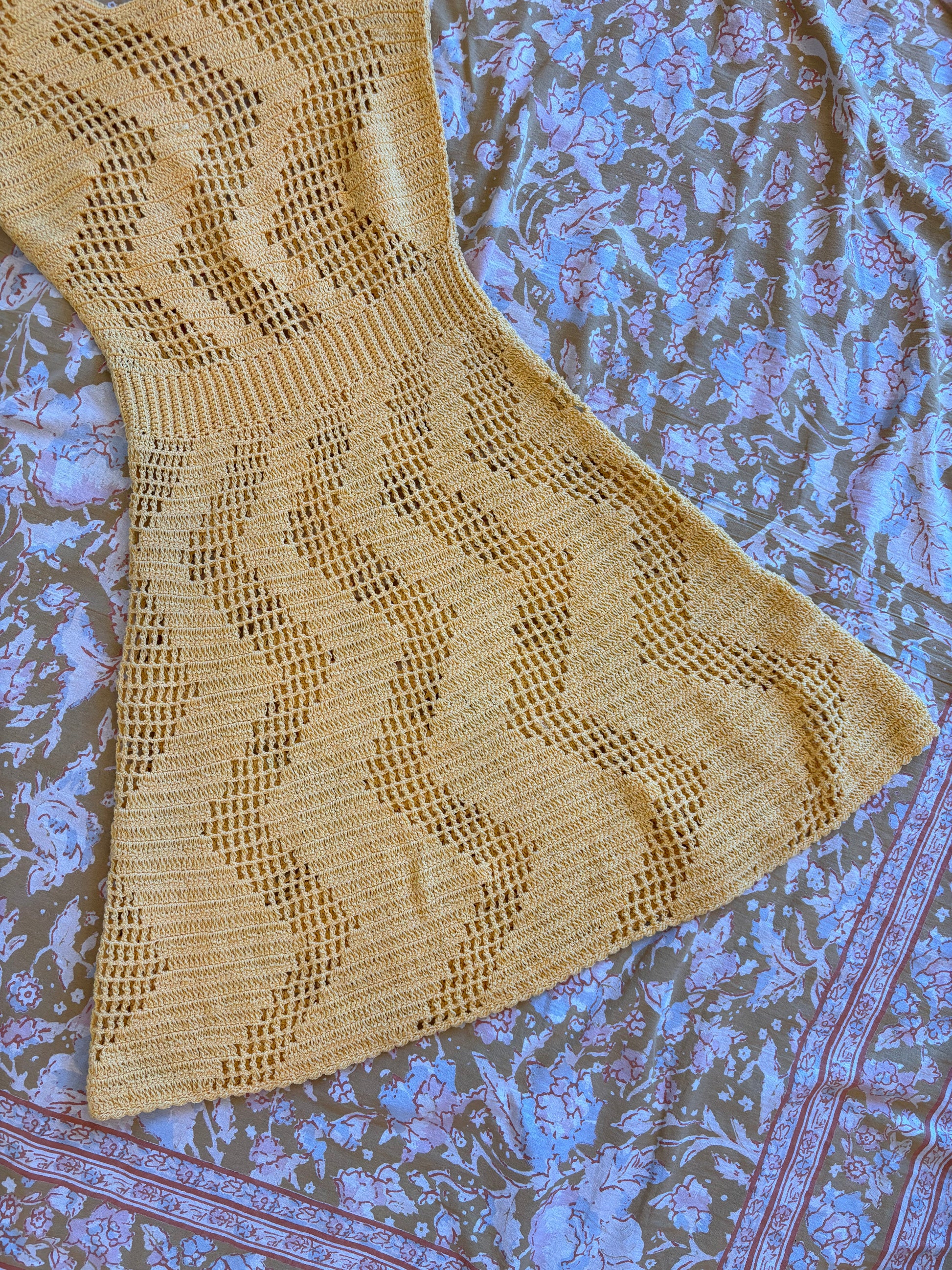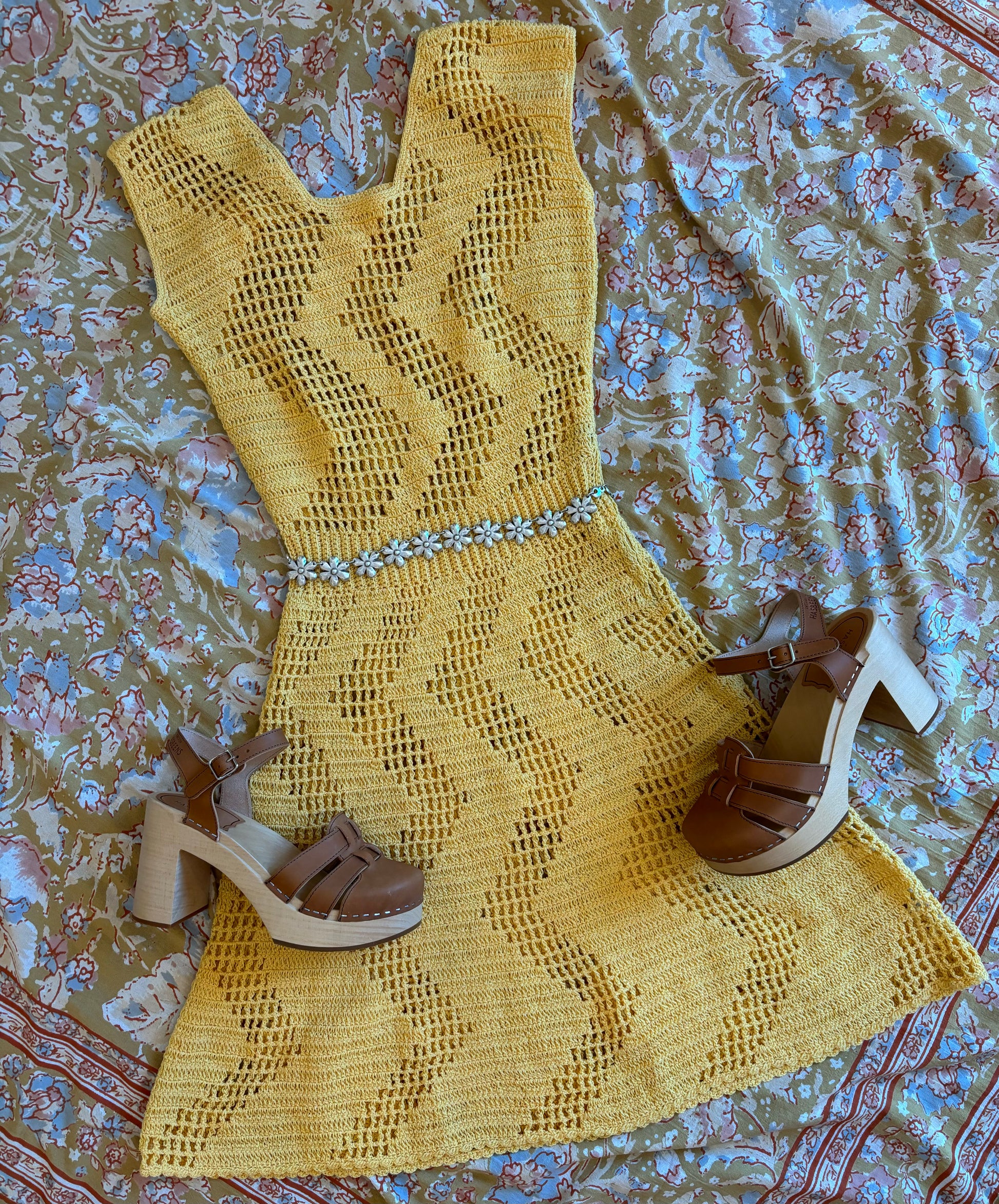 This adorable 70s mini crochet dress. Perfect for a casual day out or a summer party, it's a must have to any vintage collectors wardrobe.